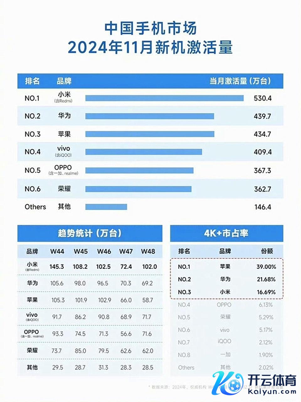 其次,在小米之后,和苹果辩认以439.7万台和434.7万台的激活量位列第二和第三。天然未能夺得榜首,但这两家品牌的商场显露依然矫健。
