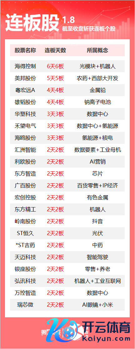 1月8日,数据知道,A股商场打算74只个股涨停。其中机器东谈主宗旨股海得限制6连板,钠离子电板宗旨股雄韬股份4连板。一图速览当天连板股>>