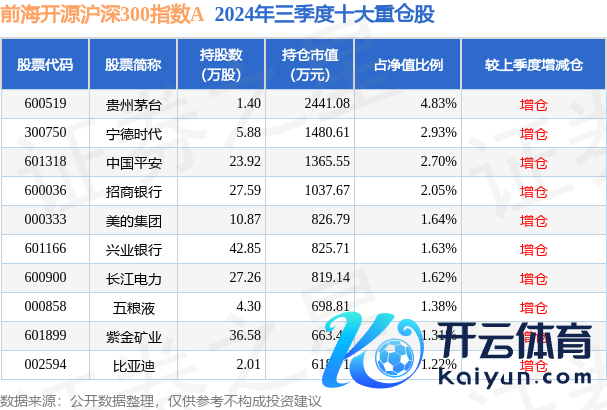 前海开源沪深300指数A为指数型-股票基金,阐述最新一期基金季报潜入,该基金金钱建立:股票占净值比94.3%,债券占净值比3.59%,现款占净值比2.01%。基金十大重仓股如下: