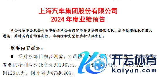 1月24日,上汽集团公告,展望2024年净利润15亿元到19亿元,与上年同期比拟,将减少122亿元到126亿元,同比减少87%到90%。