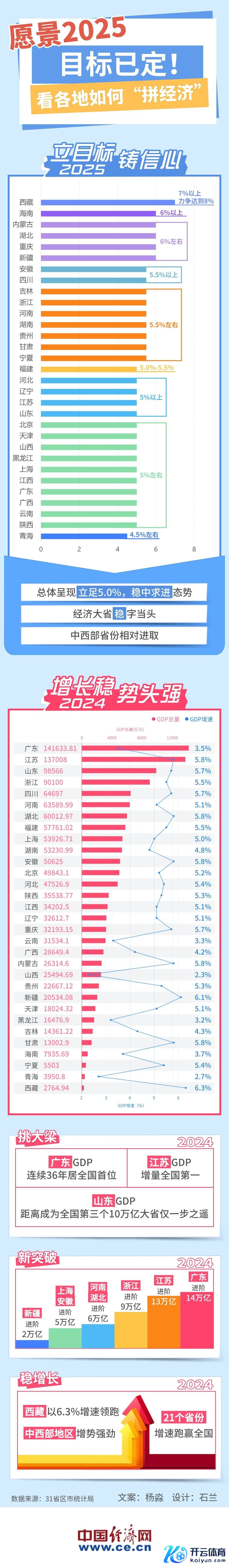 宇宙两会召开在即,2025年各地怎么干?梳理各省区市经济增长筹划,30个省份预期筹划不低于“5%驾御”,这意味着中高速增长是“十四五”收官之年的“主旋律”。各地2025年GDP增速筹划的设定,体现出积极求实的计谋导向体育游戏app平台,又展示出在激动经济高质料发展上的坚决和信心和决心。